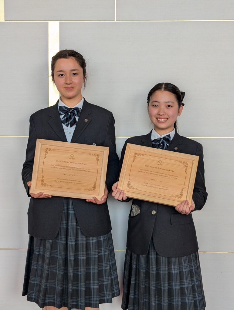 今年度のTEP-CUP(東京都高等学校英語プレゼンテーションコンテスト)に、本校高校2年生2名のチームが「メンタルヘルス」をテーマに出場し、約270組の出場者の中から奨励賞に選ばれました。去る3月21日に大手町三井ホールにて行われた表彰式では2人が壇上で賞状を受け取ったほか、先立って行われたJETによるフィードバックのセッションでは、東京都で勤務するJETの先生方からプレゼンテーションについて有益なフィードバックを受けました。