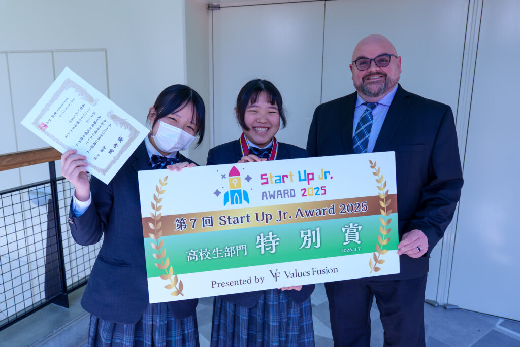 さらに、小・中・高校生を対象にした「スタートアップJr.アワード2025」の大会では、全国2,000人の応募者の中から選ばれた3名のうち、本校高校2年生が特別賞を受賞、夢を描き社会へ一歩踏み出すプレゼンテーションを披露しました。